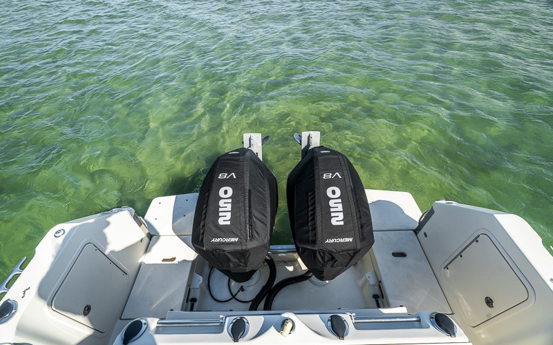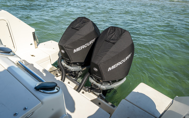 At the helm, she is fitted with twin Simrad NSS EVO3 displays, radar, autopilot, depth sounder and VHF with AIS. Paired with electronic Mercury controls and a bow thruster, she is straightforward to handle both underway and around the marina. Powered by twin Mercury V8 250hp outboards, she cruises comfortably between 20 – 30 knots with a top speed of around 40 knots.