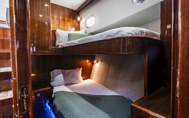 Below deck, accommodation is provided for six across three generous cabins, including a full-beam master suite, a forward double cabin, and a twin single berth guest cabin. Each cabin is air-conditioned and serviced by two well-appointed bathrooms featuring electric marine toilets and separate showers. Entertainment throughout the vessel is provided by dual Smart TVs and a Fusion stereo system, while twin Onan generators ensure reliable onboard power supported by a comprehensive Victron Energy management system.
