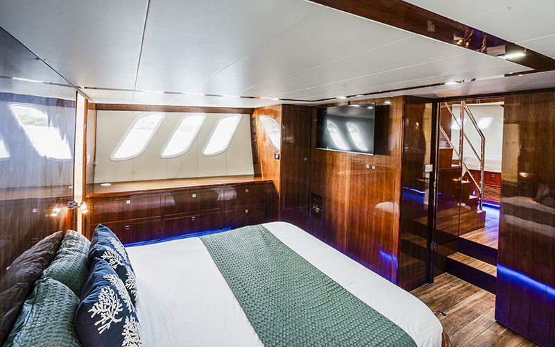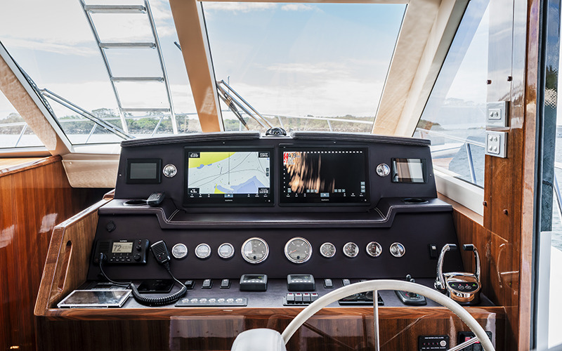 Powered by twin 705hp Cummins QSM11 diesels coupled with ZF gearboxes, she delivers an effortless and economical cruise at 8 knots while consuming just 21 litres per hour, with a top speed of 16 knots when required. The twin Quick X19 gyros are a standout feature, delivering exceptional stability both underway and at rest. Their effectiveness is immediately apparent, significantly reducing roll and keeping the vessel level and composed in a range of conditions. Combined with Lewmar bow and stern thrusters and hydraulic steering, she is easy to handle and responds predictably, making close-quarters manoeuvring and extended cruising both smooth and controlled. Her low-profile design also allows easy passage beneath the Sundale Bridge on the Gold Coast, providing greater flexibility for cruising the Broadwater and surrounding waterways.